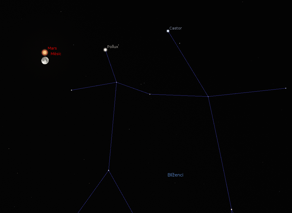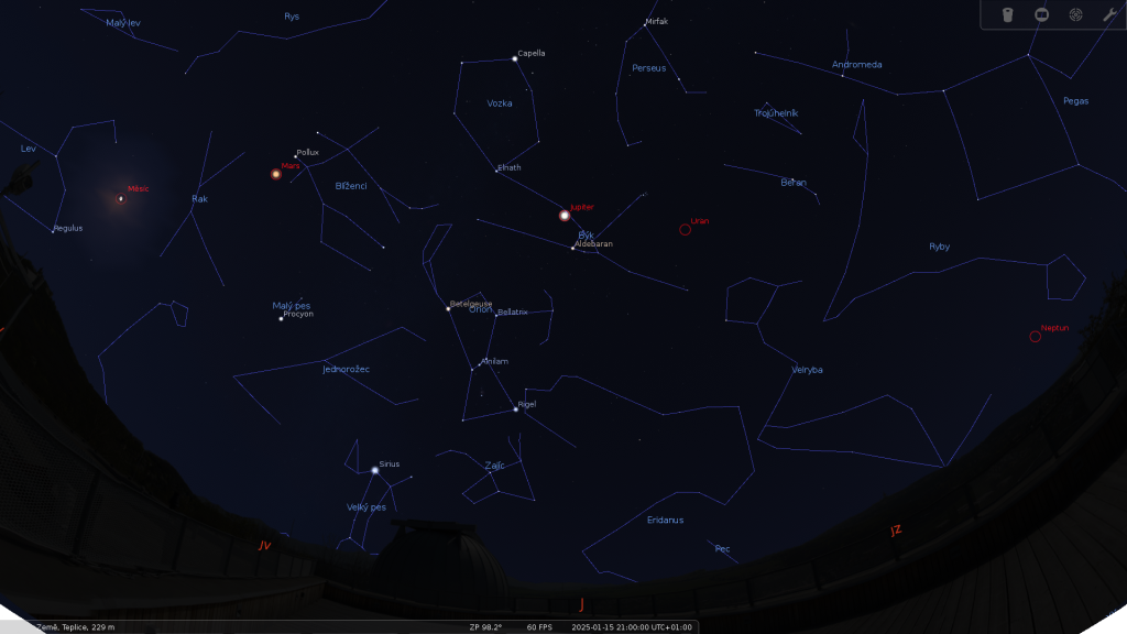 | 14. 1. 2025 | konjunkce Měsíce a Marsu, úhlová vzdálenost od středu obou těles přes 33´, tj. zhruba velikost Měsíce v úplňku |