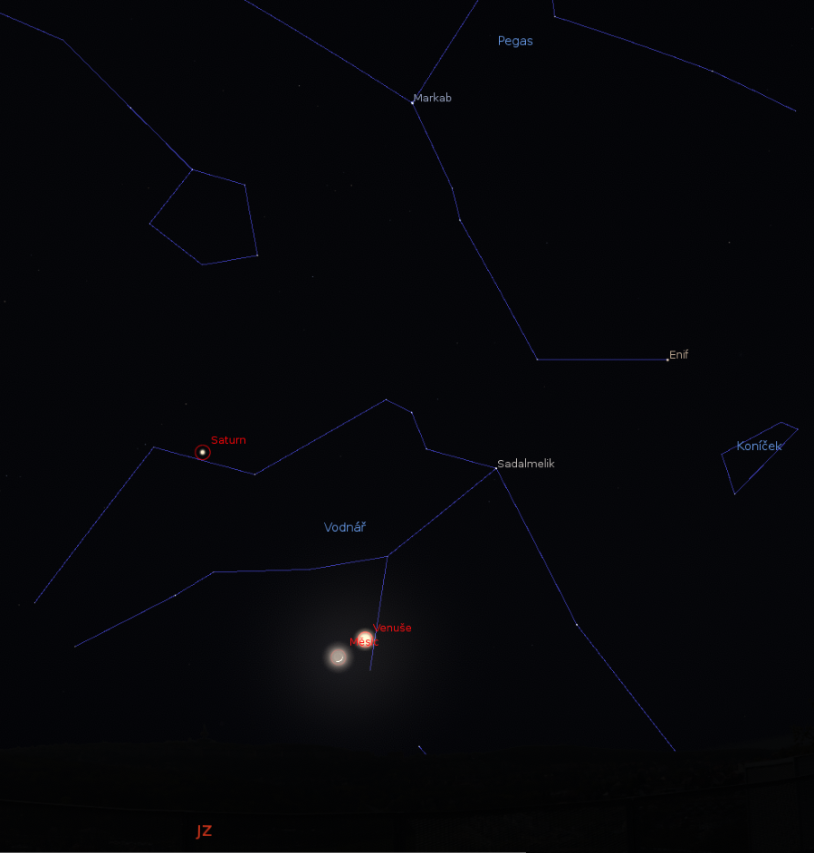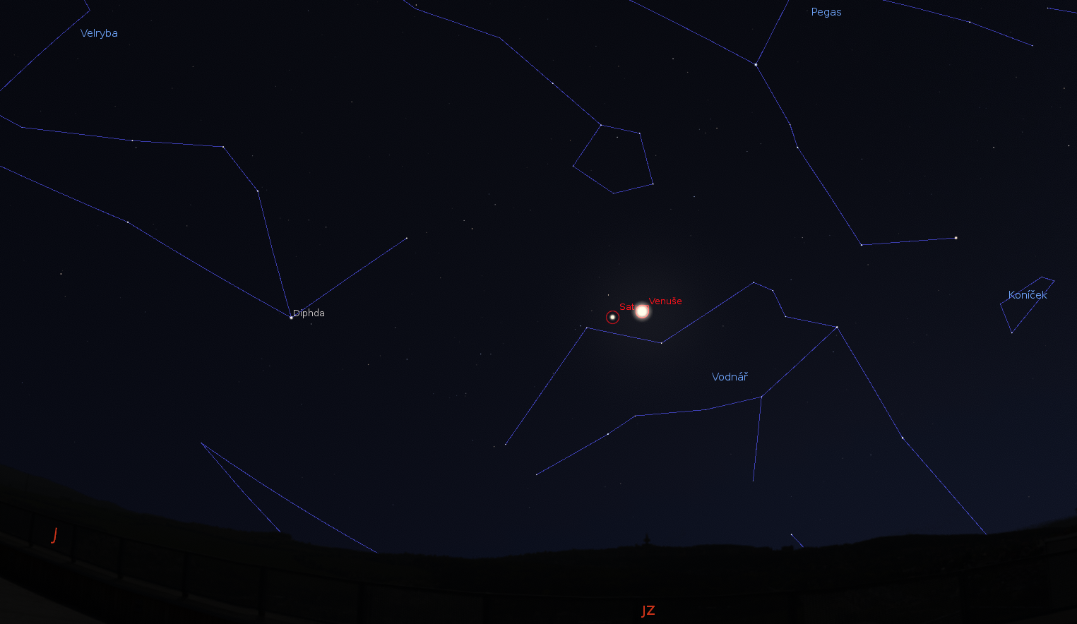 Saturn: jasný (1,1 mag), večer nad JZ ve Vodnáři