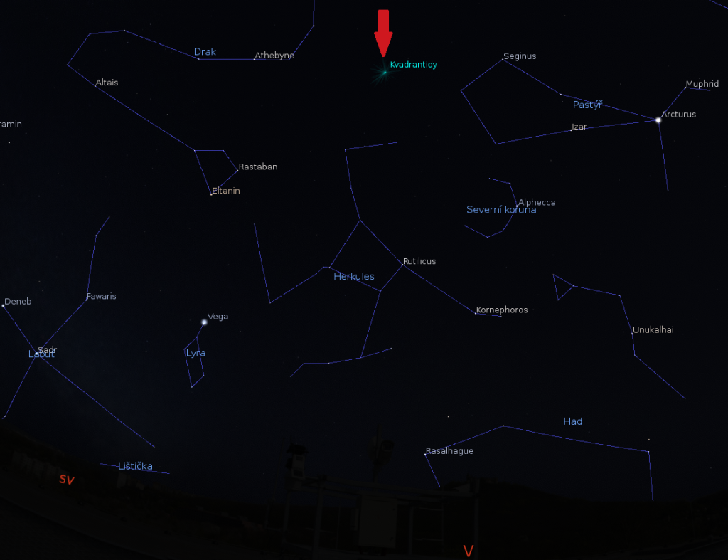 Začátek roku se nese ve znamení Kvadrantid, jednoho z nejbohatších meteorických rojů v celém roce. Vrchol jeho aktivity nastává 3. ledna v 16:00 SEČ. Pozorovat meteory můžeme ideálně 3. nebo 4. ledna ve druhé polovině noci, nejlépe v brzkých ranních hodinách. Právě v těch je totiž radiant roje vysoko nad východním obzorem.