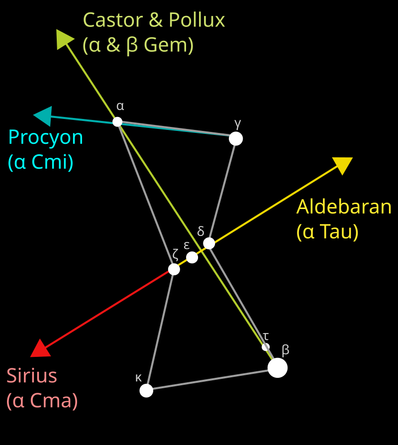 Opačným směrem od opasku, tedy jihovýchodně, lze najít souhvězdí Velkého psa s nejjasnější hvězdou celé noční oblohy, Síriem (α CMa). Asi 4° jižně od Síria můžeme za pomoci malého dalekohledu spatřit několik jasných členů relativně řídké otevřené hvězdokupy M41.