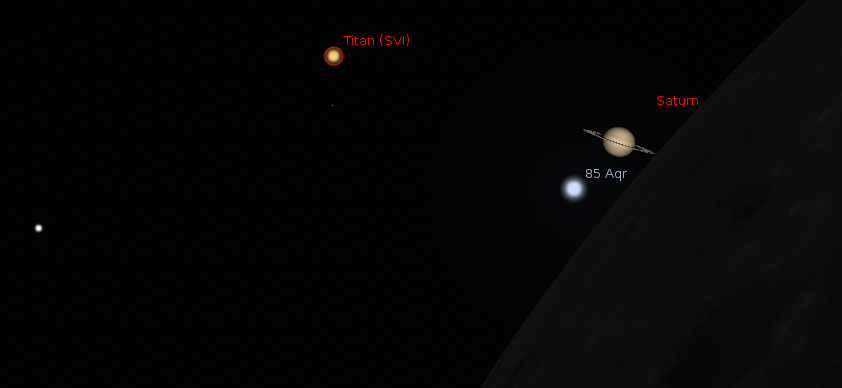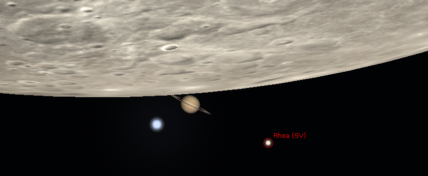 | 19:39 SEČ* konec zákrytu, v dalekohledu jihozápadně nápadný měsíc Rhea |
