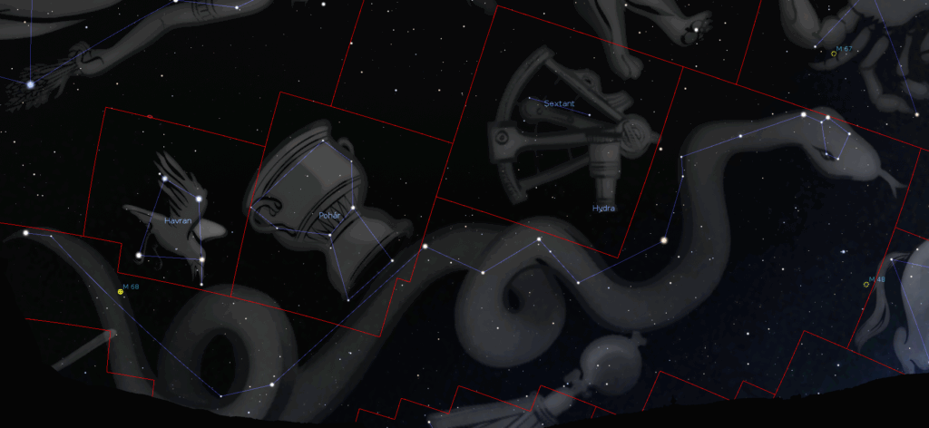 Do 17. století byly nedílnou součástí Hydry souhvězdí Sextantu, Poháru a Havrana. Tato relativně malá a méně známá souhvězdí jsou tvořena převážně nevýraznými hvězdami, takže na přesvětlené městské obloze snadno zaniknou.