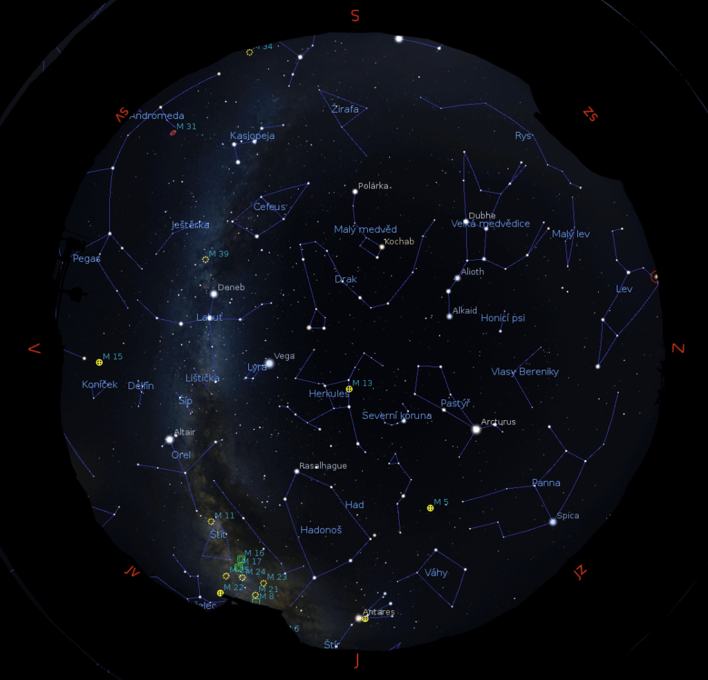 Vysoko nad severozápadním obzorem spatříme sedm jasných hvězd tvořících známý obrazec Velký vůz. Jihovýchodně od hvězdy Alkaid (η UMa), poslední hvězdy oje Velkého vozu, spatříme souhvězdí Pastýře s jasným Arkturem (α Boo). Ještě dále východním směrem nalezneme nevýrazného Hada a Hadonoše.