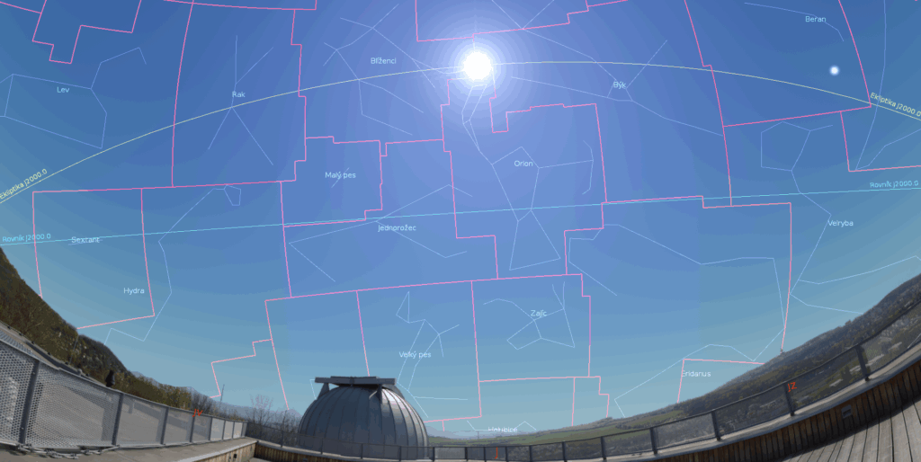 V obrázku níže si všimněme, v jakém souhvězdí se Slunce v den letního slunovratu nachází. Podle zvěrokruhu vstupuje Slunce do znamení Raka, nicméně z obrázku je jasně patrné, že se kotouč Slunce nachází na rozhraní souhvězdí Býka a Blíženců.