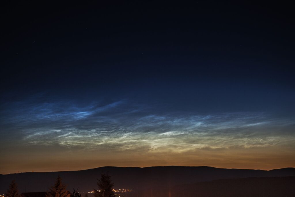 Ideální čas pro spatření NLC je mezi jedenáctou hodinou a půlnocí, kdy jsou tyto oblaky osvětlovány Sluncem. NLC obvykle spatříme ve výšce „pouze“ kolem 20° nad horizontem. Více se o tomto zajímavém atmosférickém úkazu dozvíte ZDE.