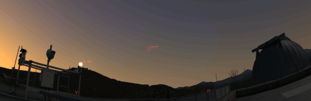 Planeta Venuše, se spolu se Saturnem, po více jak měsíční odmlce přesunula na ranní oblohu. Saturn vychází v polovině měsíce v 1:45 SELČ. Spatříme jej v západní části Ryb jako nikterak jasnou „hvězdu“ (1,04 mag).  Venuše vychází zhruba hodinu po Saturnu a nalezneme ji velmi nízko nad východem jako jasnou Jitřenku (-4,20 mag).