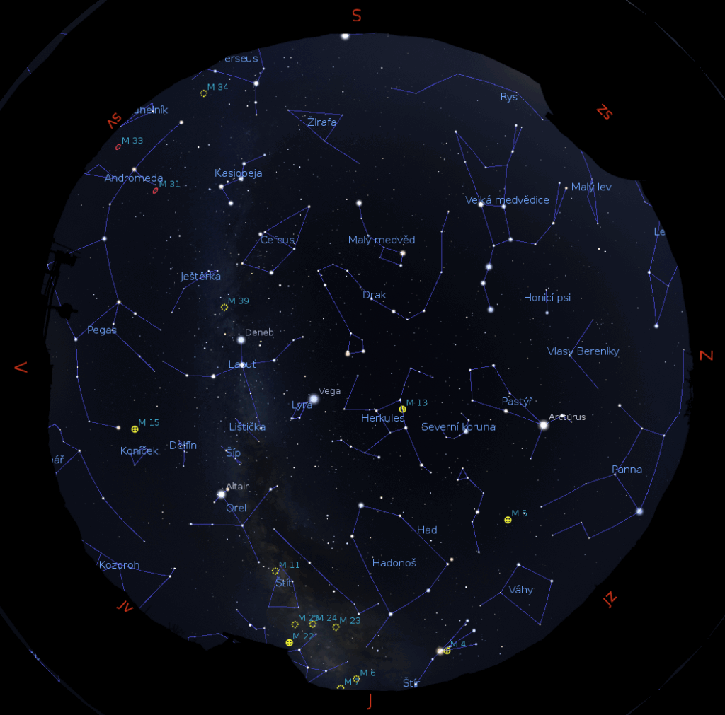 Pokud se zaměříme na jižní obzor kolem půlnoci, spatříme trojici jasných hvězd, které tvoří obrazec známý jako Letní trojúhelník. Vrcholy trojúhelníku tvoří jasné body: Vega (α Lyr) 0,03 mag, Altair (α Aql) 0,76 mag a Deneb (α Cyg) 1,25 mag.