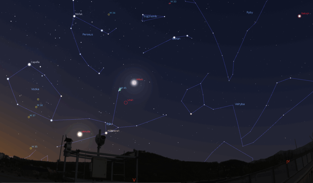 20. července dochází v časných ranních hodinách nad východem k zajímavému seskupení několika těles v souhvězdí Býka (řazeno od východu na západ): planety Venuše, hvězdy Aldebaran (α Tau), otevřené hvězdokupy M45 (Plejády) a Měsíce. Měsíc je během této noci ve fázi úzkého srpku, zhruba 4 dny před novem. Přes 6° jihovýchodním směrem od Měsíce spatříme za pomoci alespoň triedru Uran (5,8 mag). Severozápadním směrem od Měsíce spatříme vysoko nad obzorem druhou největší planetu Sluneční soustavy: Saturn (0,9 mag).