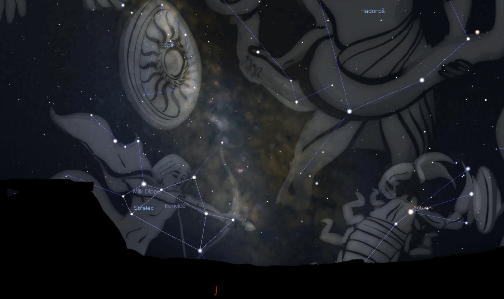 Během července krátce po setmění kulminuje výrazné souhvězdí Štíra (α Sco). Pomyslné oko štíra tvoří nejasnější hvězda celého souhvězdí, naoranžovělý Antares. Jedná se o tzv. červeného veleobra, tedy typ velké a hmotné hvězdy v pokročilém stádiu hvězdného vývoje, která spotřebovala téměř veškeré zásoby vodíku v jádře a rozepnula své vnější vrstvy do prostoru.