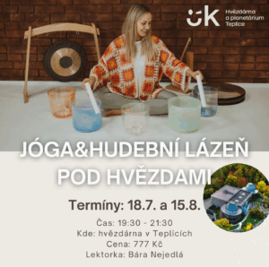 Těšit se můžete na dvě hodiny plné péče o sebe sama: v první části akce tělo jemně rozhýbeme skrze jógu, v druhé polovině pak tělo, mysl i duši zrelaxujeme skrze hudební lázeň. To celé se bude odehrávat na střeše teplické hvězdárny spolu se zapadajícím sluncem a úžasným výhledem. Tato akce je opravdu jedinečná a uskuteční se pouze dvakrát během léta, přičemž tento termín je poslední.
