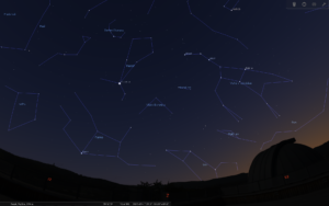 Večer nad západním obzorem spatříme souhvězdí Pastýře se čtvrtou nejjasnější hvězdou celé oblohy Arcturem (α Boo). Nízko nad západem nalezneme souhvězdí Panny s jasnou Spicou (α Vir). Od Panny směrem na severovýchod se nachází poměrně jasná Severní koruna, dále na východ nalezneme Herkula a Hadonoše. Nad jihem, na tmavé obloze, můžeme spatřit vysoko vystupující stříbřitý pás hvězd. Je to část naší domovské galaxie, Mléčné dráhy. Výše nad obzorem spatříme obrazec složený